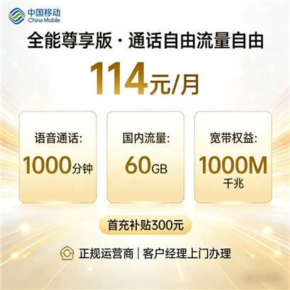 移动 全能尊享版套餐 114元/月 号卡归属地:武汉 |